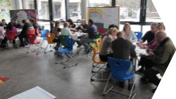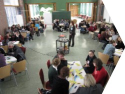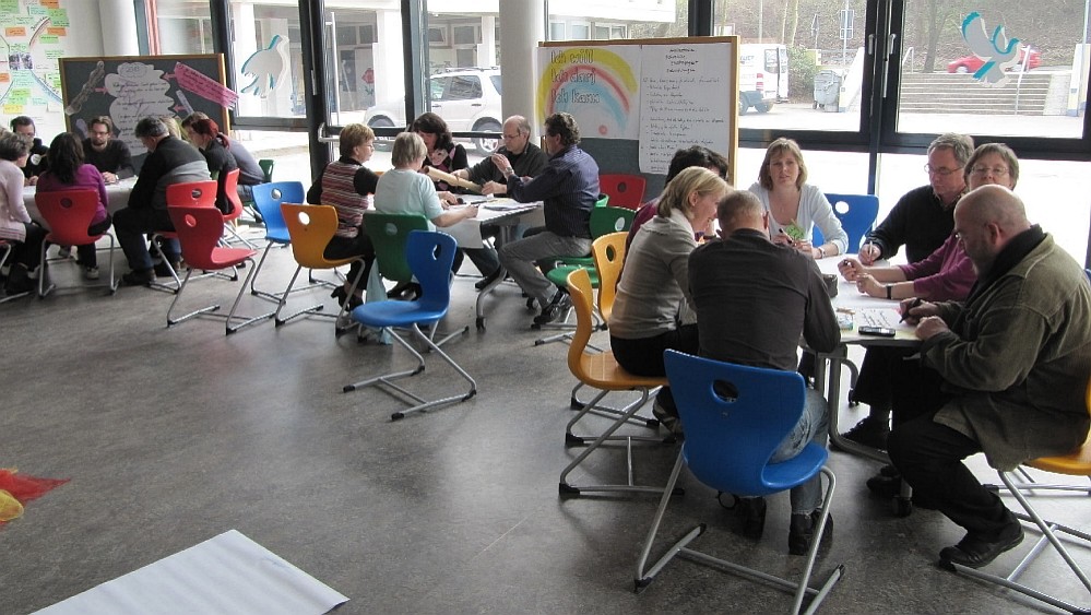 Pädagogischer Tag – Lehrerinnen und Lehrer eines Gymnasiums entwickeln Projekideen, um reibungslos in der Einführung des Ganztags voranzukommen, Energien zu bündeln, Kommunikation zu erweitern und die Arbeitsplatzsituation in ihrer Schule zu verbessern. Dabei werden Eltern- und Schüler-Vertretung zeitweise in den Entwicklungsprozess einbezogen.