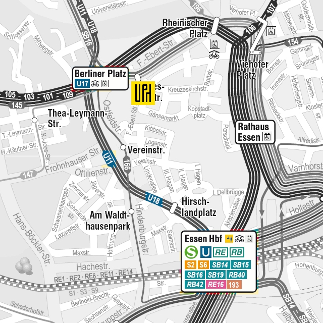 U-Bahn-Linien, Essen/Ruhr Das Unperfekthaus befindet sich mitten im Zentrum von Essen an der Ruhr (Nordrhein-Westfalen). Es ist vom Hauptbahnhof in 15 Minuten zu Fuß durch die Fußgängerzone Kettwiger Str. zu erreichen; am Markt nach links zum Kornmarkt und durch die Limbecker Str. gehen. Oder die U-Bahn-Linien U11, U17, U18 (Berliner Platz) als schnelle Verbindung vom Hauptbahnhof nutzen. Der Eingang befindet sich östlich des Einkaufszentrums Limbecker Platz, zu dem es sich gut durchfragen lässt. Dort und am Europa-Center / Cinemaxx-Kino, Berliner Platz 5, befinden sich auch Parkhäuser.