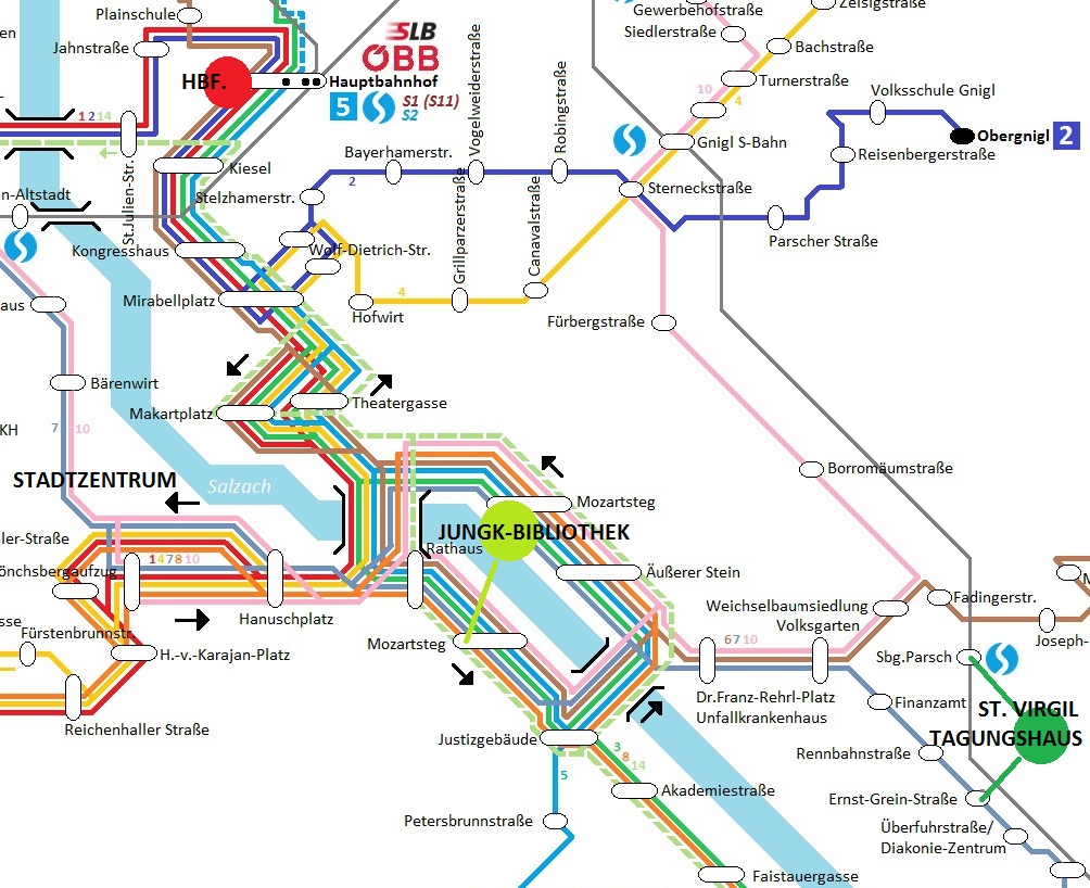Obus-Netzplan mit Hbf. Salzburg, Jungk-Bibliothek, Tagungshaus St. Virgil.