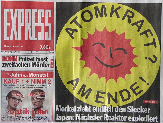 • 15.3.2011 aus Köln: "Merkel zieht endlich den Stecker", titelte ein Kölner Boulevardblatt. Das mahnt dazu, wachsam zu bleiben, damit nach den Wahlen nicht wieder eingesteckert wird. Mich irritiert, dass die "Atomkraft? nein danke"-Sonne nach 36 Jahren auf der Seite 1 einer solchen Zeitung landet. Gegen Atomkraft zu sein hat viel von diesem sonnigen Lachen verloren.