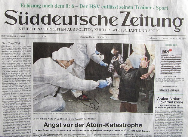 mit großer Sorge um das Schicksal der Menschen in Japan schauen wir auf die unglaublichen Ereignisse in Fukushima. Das von Reuters verbreitete, heute auf der Süddeutschen Zeitung als Titel abgedruckte Foto eines kleinen Jungen, der die Hände wie bei einem Überfall in die Höhe hebt, als der weiß vermummte Mann ihn mit dem Geigerzähler abtastet, berührt mich ganz tief. Unfassbar, daß das, was Robert Jungk vor 33 Jahren in seinem Buch Der Atomstaat - Vom Fortschritt in die Unmenschlichkeit beschrieb, so nah ist: Dieser Griff in die Zukunft, die Angst vor den Folgeschäden der außer Kontrolle geratenen Kernkraft wird zur größten denkbaren Belastung der Menschheit: Sei es als Giftspur, die unauslöschlich bleibt, sei es auch nur als Schatten einer Sorge, die niemals weichen wird.