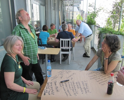 An mehreren Tischen auf dem Balkon des Unperfekthauses, mit einem Blick von oben auf die reale Welt einer