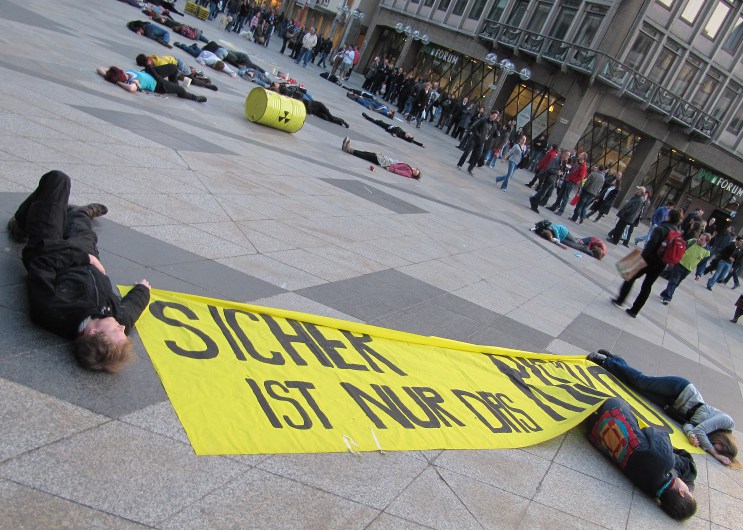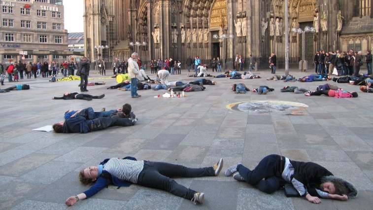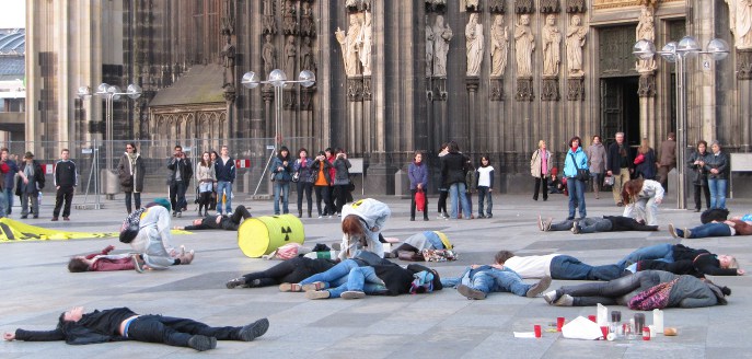 15.3.2011 um 18:00 Uhr: Zugang zum Kölner Hauptbahnhof gesperrt, warnt ein Schild. Ein mit gelb-schwarzem Warnhinweis versehenes Metallfass von etwa 2 Kubikmeter vermutlich radioaktiven Inhalts wird an der sonnigen Westseite des Weltkulturerbes Kölner Dom über die Domplatte befördert. Unfassbar: Da gleitet den in weißen Schutzanzügen hantierenden Arbeitern das Fass aus, ein donnernder Knall verstört Touristen und Einwohner Kölns. Etwa vierzig von ihnen fallen sofort in sich zusammen, andere suchen das Weite, wieder andere fotografieren die furchtbare Situation. Der Strahlentrupp ist schnell zur Stelle, mit Hilfe mobiler Geigerzähler wird die Kontamination sorgsam gemessen. Und die offensichtlich verstrahlten Menschen werden kompetent erstversorgt.