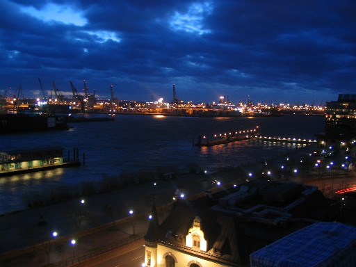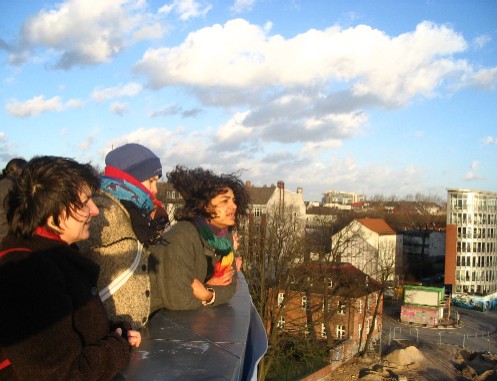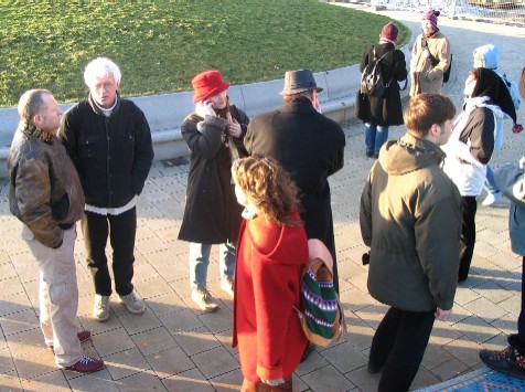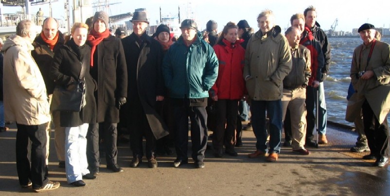 Teilnehmerinnen und Teilnehmer am Jahrestreffen ZW2005 warten bei rauhem Wind im Hamburger Hafen auf die Fähre.