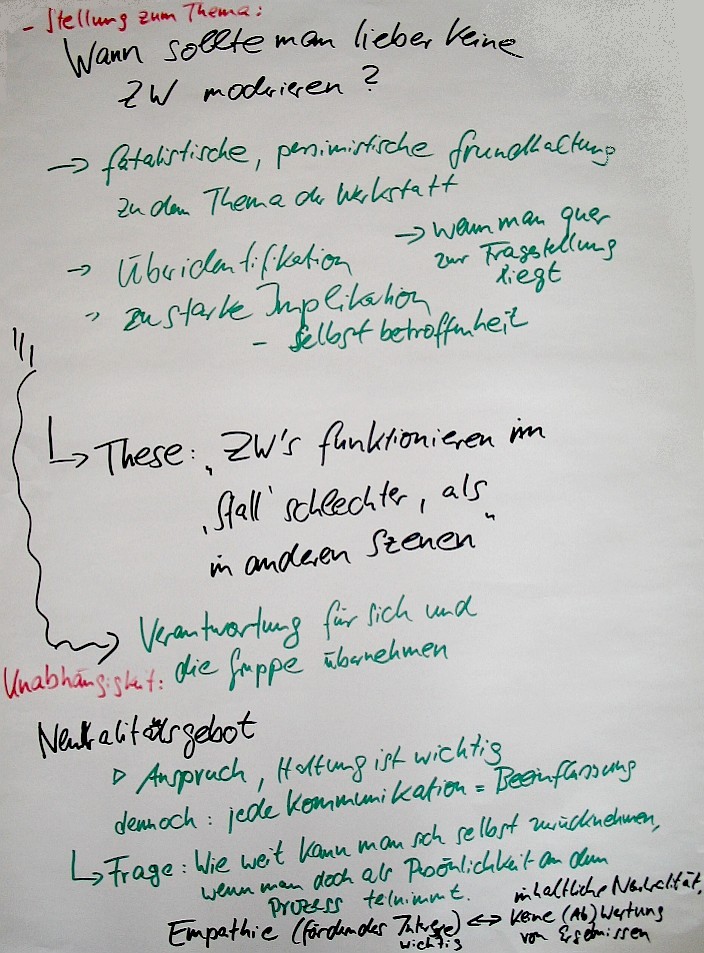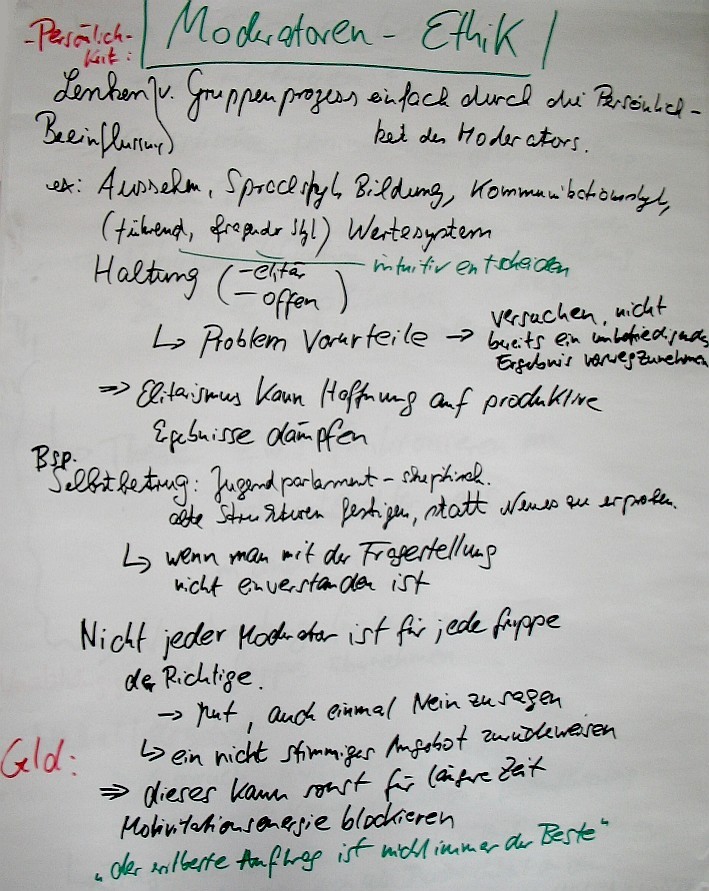 [ Hinweis: Das Arbeitsgruppenergebnis liegt außer in Stichworten auch in Form eines im Anschluss ausführlich ausgearbeiteten Text zur Moderatoren-Ethik vor. Mehr dazu am Ende der folgenden Poster-Abschrift. ]