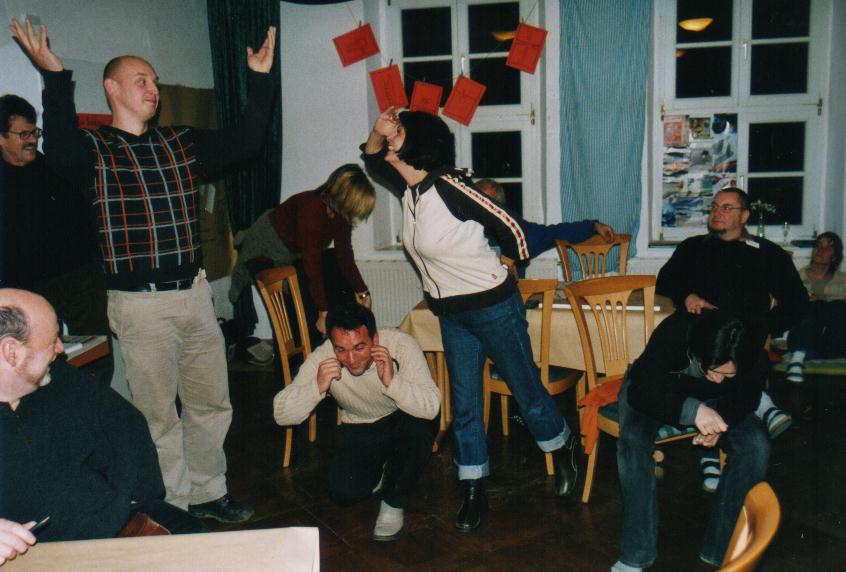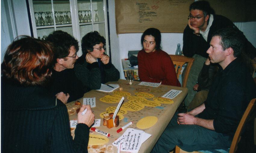 In unserer Arbeitsgruppe sind Angelika, Anne, Axel und Thomas. Mich überrascht die Skepsis der Anderen gegenüber unserem Vorschlag, das Thema methodisch zu bearbeiten. Wir sagen etwas zu unseren Beweggründen für den Vorschlag einer Arbeitsgruppe zur Großgruppen-Moderation: eine schwierige Zukunftswerkstatt in Berlin 2003. Diese Erfahrungen wollen wir in positive Erkenntnisse verwandeln.